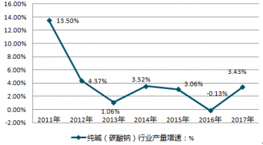 2011-2019年中國純堿(碳酸鈉)行業(yè)產(chǎn)量增速情況