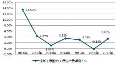 2011-2019年中國純堿(碳酸鈉)行業(yè)產(chǎn)量增速情況