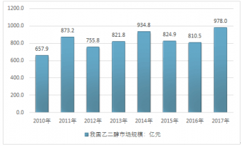 據(jù)統(tǒng)計(jì)2016年我國乙二醇市場規(guī)模為810.5億元,2019年我國乙二醇市場規(guī)模達(dá)到978.0億元。