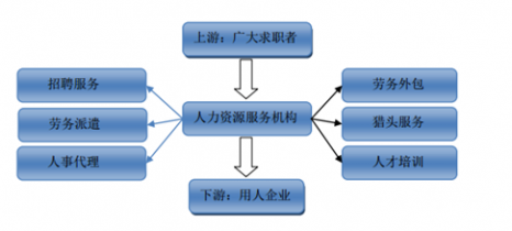 人力資源服務(wù)產(chǎn)業(yè)鏈?zhǔn)欠⻊?wù)鏈,是以人力資源服務(wù)的相關(guān)產(chǎn)品或服務(wù)、資本、知識和技術(shù)為紐帶,以客戶需求和市場資源為導(dǎo)向,以追求人力資源服務(wù)產(chǎn)品的附加值為目標(biāo),形成的網(wǎng)絡(luò)關(guān)聯(lián)的鏈?zhǔn)浇M織,產(chǎn)業(yè)鏈上的企業(yè)提供與人力資源管理和服務(wù)相關(guān)的有形或無形的服務(wù)。目前,人力資源服務(wù)行業(yè)的上游是廣大求職者,下游是各類企業(yè)及機(jī)關(guān)事業(yè)單位等客戶。