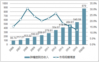 據(jù)統(tǒng)計,2015年腫瘤醫(yī)院收入達到546億元,近三年復(fù)合增長率達到15.4%,假如未來幾年收入增速保持在10%以上,預(yù)計2020年市場規(guī)模將達到879億元以上。