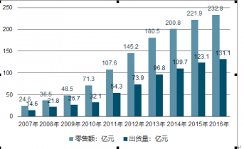 2015年我國戶外用品市場規(guī)模處于快速增長的成長階段。2016年我國戶外用品行業(yè)零售市場規(guī)模約232.8億元,同比2015年的221.9億元增長了4.91%,戶外用品行業(yè)出貨金額約.1億元,同比2015年的123.1億元增長了6.5%。