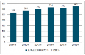 2015 年全球企業(yè)級(jí)軟件市場(chǎng)規(guī)模為3,100 億美元。2016 年,企業(yè)級(jí)軟件市場(chǎng)將增長至3,260 億美元,與2015 年相比增長5.3%。