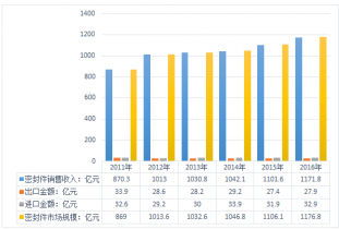 2016年我國密封件行業(yè)銷售收入約1178.1億元,進(jìn)口規(guī)模約32.9億元,出口規(guī)模約27.9億元,國內(nèi)密封件行業(yè)市場消費(fèi)規(guī)模約1176.8億元。