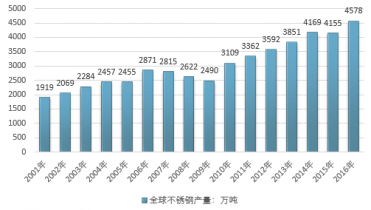 根據(jù)國際不銹鋼論壇(ISSF)發(fā)布的統(tǒng)計數(shù)據(jù),2016年全球不銹鋼產(chǎn)量4578萬噸,較2015年的4155萬噸增長10.18%。