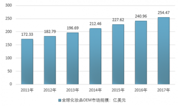 在需求的拉動下,全球化妝品OEM市場增長穩(wěn)定,從2011年的172.33億美元增長至2019年的254.47億美元。