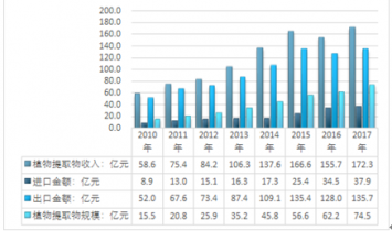 2019年我國植物提取物行業(yè)銷售收入約172.3億元,進口金額約37.9億元,出口金額約135.7億元,國內植物提取物行業(yè)市場規(guī)模約74.5億元。