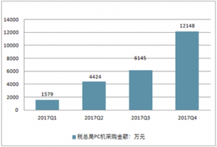 2019年國稅總局PC機(jī)采購呈現(xiàn)逐漸上升的趨勢,在四季度達(dá)到12148萬元。