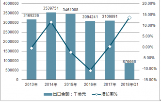 2013-2019年Q1中國(guó)自行車出口金額及增長(zhǎng)走勢(shì)