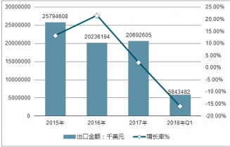 2015-2019年Q1中國船舶出口金額及增長走勢