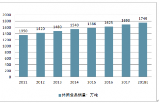 2011年-2016年中國休閑食品銷售量不斷增長,年均復(fù)合增長率達(dá)3.78%,銷售量從2011年的1350萬噸增長至2016年的1625萬噸。預(yù)計(jì)2019年全年中國休閑食品銷售量將達(dá)1693萬噸,到2019年全國休閑食品銷售量有望達(dá)到1749萬噸。