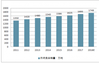 2011-2018中國(guó)休閑食品銷售量走勢(shì)