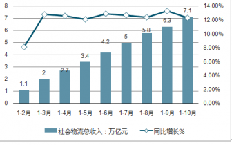 2019年1-10月全國(guó)物流業(yè)總收入及同比增長(zhǎng)