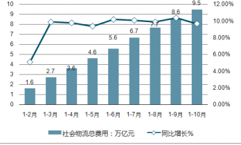 2019年1-10月全國(guó)社會(huì)物流總費(fèi)用及同比增長(zhǎng)