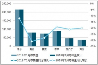 冰箱各品牌2019年1月累計銷量及增速(臺、%)