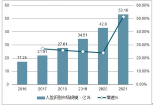 2016-2021 年國(guó)內(nèi)人臉識(shí)別市場(chǎng)規(guī)模預(yù)測(cè)(億元)
