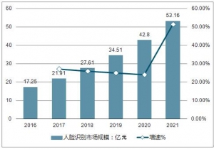 2016-2021 年國內人臉識別市場規模預測(億元)
