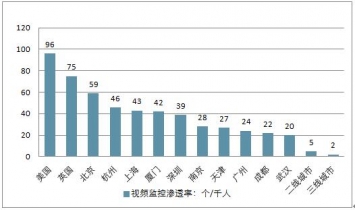 我國視頻監(jiān)控密度遠低于發(fā)達國家,監(jiān)控滲透率提升空間巨大。中國地域廣闊,安防具有難度大,成本高的特點,安防的核心為監(jiān)控。據(jù)統(tǒng)計,中國已經(jīng)建成龐大的視頻監(jiān)控網(wǎng)--“中國天網(wǎng)”,視頻監(jiān)控攝像頭超過2000 萬個,處于國際前列,但是依然存在著城市差異巨大,人均攝像頭覆蓋率較低的特點,因此我國監(jiān)控增量空間依然巨大。