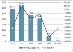 2019年1-4月中國出口牛肉147噸,同比下滑53.8%;縱觀近五年中國牛肉出口數(shù)量情況,年均復合增長率為-37.06%。