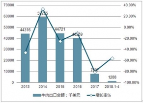2013-2019年中國牛肉出口金額及增長率走勢