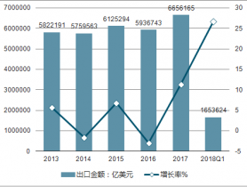 2013-2018Q1年中國摩托車出口金額及增長走勢