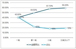 年輕人口回流、較快的中產(chǎn)化與較低的負(fù)債率等因素促成了二三線城市的消費(fèi)升級。各線城市消費(fèi)支出增速出現(xiàn)分化,其中二、三線城市消費(fèi)支出金額增速高達(dá)57.7%、 59.2%,高于一線城市。