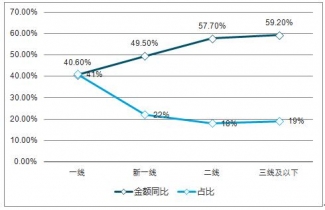 年輕人口回流、較快的中產(chǎn)化與較低的負債率等因素促成了二三線城市的消費升級。各線城市消費支出增速出現(xiàn)分化,其中二、三線城市消費支出金額增速高達57.7%、 59.2%,高于一線城市。