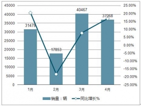 2019年4月客車合計(jì)銷售37068輛,環(huán)比下滑8.4%,同比增長16.92%。1-4月累計(jì)銷售126869輛,同比增長8.31%。
