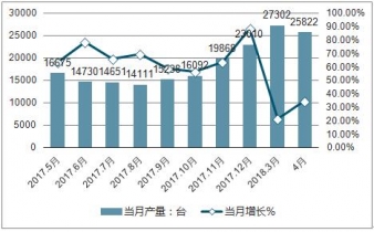 2019年4月中國挖掘機(jī)產(chǎn)量為25822臺(tái),同比增長35.8%。2019年1-4月中國挖掘機(jī)產(chǎn)量為87534臺(tái),累計(jì)增長35.7%。