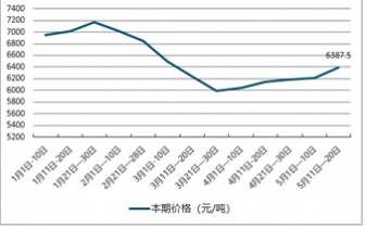 截止至2019年5月中旬,純苯價(jià)格為6387.5元/噸,環(huán)比5月上旬價(jià)格上漲171.1元/噸,漲幅為2.8%;1月中旬,純苯市場價(jià)格達(dá)到最高值,為7171.9元/噸,環(huán)比1月上旬價(jià)格上漲159.8元/噸,漲幅為2.3%。3月下旬,純苯價(jià)格呈現(xiàn)最低值,為5987.5元/噸,環(huán)比3月中旬下跌251.8元/噸,跌幅為4%。最高值與最低值相差1184.4元/噸。