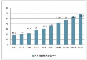 2012-2021年中國汽車消費融資滲透率預測