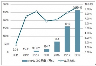 2011-2019年中國P2P車貸交易規模及占比走勢
