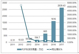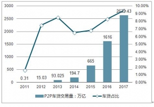 017年P(guān)2P行業(yè)總成交量為2639萬億元,車貸行業(yè)整體的成交量占網(wǎng)貸行業(yè)總量的9.41%,此占比從2014年開始逐步上漲。