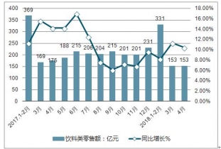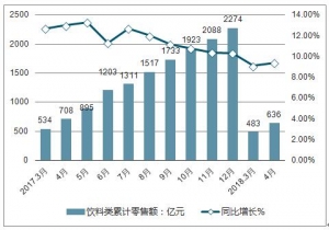 2019年4月份飲料類零售總額達153億元,與去年同期增長10.4%。2019年1-4月中國飲料類零售總額達636億元,與去年同期增長9.4%