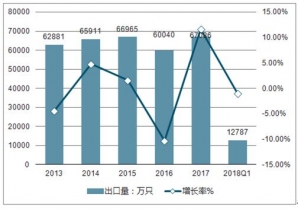 2019年一季度中國電動(dòng)手表出口12787萬只,同比下降0.9%。縱觀2013-2019年我國電動(dòng)手表出口量情況,五年間出口量整體趨勢比較平穩(wěn),年均復(fù)合增長率為1.63%。