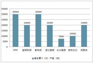 以 50%粉計, 全球 VE 市場由 DSM(30000 噸)、 BSF(20000 噸)、新和成(30000噸) 和浙江醫(yī)藥(20000 噸) 四大寡頭壟斷,競爭格局穩(wěn)定, CR4 產(chǎn)能占比超 70%;另外北大醫(yī)藥旗下西南合成有 7500 噸 VE 產(chǎn)能,但由于生產(chǎn)成本較高,自 2015 年開始逐漸停產(chǎn); 近年來,吉林北沙制藥 2014 年新增 9000 噸 VE 產(chǎn)能技改,產(chǎn)能提升到 10000噸, 冠福股份旗下能特科技于 2016 年 8 月份投資 5.7 億元建設(shè)年產(chǎn) 20000 噸維生素 E項目, 2017 年 3 月份開始正式投產(chǎn)對外銷售,全球產(chǎn)能提升約 30%。目前,全球 VE 全部總產(chǎn)能約 13.75 萬噸。