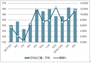 4月份,原油加工量4958萬噸,同比增長11.5%,比上月加快3.2個百分點(diǎn);日均加工165.3萬噸,比上月減少0.9萬噸。