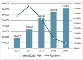2013-2019年中國(guó)啤酒進(jìn)口量及同比增長(zhǎng)走勢(shì)