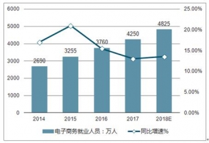 從電子商務(wù)就業(yè)人員情況來(lái)看:2017全年中國(guó)電子商務(wù)就業(yè)人員達(dá)4250萬(wàn)人,同比增長(zhǎng)13.03%; 2019年中國(guó)電子商務(wù)幾頁(yè)人員將突破4800萬(wàn)人。