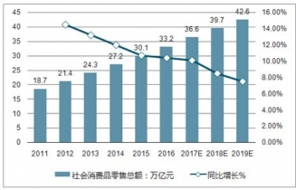 2013-2019年中國(guó)電子商務(wù)市場(chǎng)規(guī)模及同比增長(zhǎng)走勢(shì)
