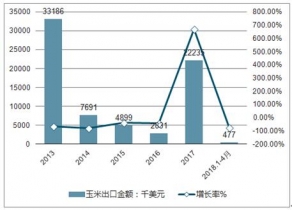 2013-2019年中國(guó)玉米出口金額及增長(zhǎng)走勢(shì)分析