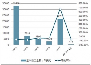 2013-2019年中國(guó)玉米出口金額及增長(zhǎng)走勢(shì)分析
