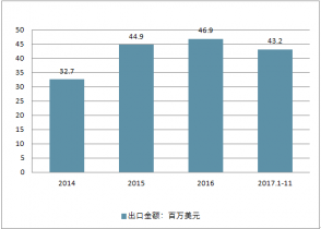 2016年我國出口白酒1607.0萬升,出口數(shù)量同比下降0.7%;出口總金額為46877.7萬美元,出口金額同比增長4.3%。2019年1-11月,我國白酒出口1480.2萬升,出口金額為4320.9萬元。