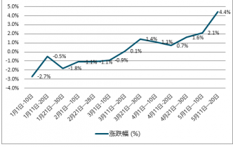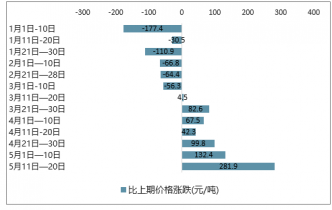 截止至2019年5月中旬,柴油價(jià)格為6712.4元/噸,環(huán)比5月上旬價(jià)格上漲281.9元/噸,漲幅為4.4%;柴油市場(chǎng)價(jià)格亦在此時(shí)達(dá)到目前為止本年度最高值。3月上旬,柴油價(jià)格呈現(xiàn)最低值,為6001.4元/噸,環(huán)比2月下旬下跌56.3元/噸,跌幅為0.9%。最高值與最低值相差711元/噸。