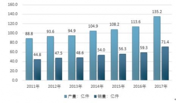 2011-2017年我國(guó)男裝行業(yè)產(chǎn)銷量 |