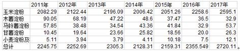 2011-2017年中國淀粉行業(yè)細(xì)分產(chǎn)量及總產(chǎn)量情況 單位:萬噸
