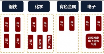工業(yè)氣體主要包括氧氣、氮氣、氫氣、一氧化碳、二氧化碳和氦氣、氖氣、氬氣、氪氣、氙氣等稀有氣體、合成氣體以及為特殊用途而配制的混合氣體等。應用領域十分廣泛,傳統(tǒng)行業(yè)主要為鋼鐵、化工,新興的應用領域包括金屬加工、煤化工、玻璃、電力、電子、醫(yī)療、公路養(yǎng)護、食品飲料等各行各業(yè)。