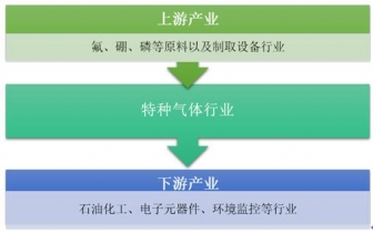 特種氣體行業(yè)產業(yè)鏈上游主要是氟、硼、磷等原料以及制取設備行業(yè),下游主要是石油化工、電子元器件、環(huán)境監(jiān)控等行業(yè)。