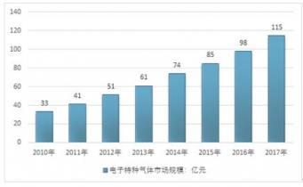 中國特種功能電子氣體市場規(guī)模近年來逐年增長,2015年特種電子氣體的市場規(guī)模為85億元,同比增長14.86%,其中應用于半導體電子特氣55.3億元。到2017,中國特種電子氣體市場規(guī)模約為115億元左右。