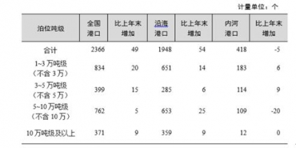 全國萬噸級(jí)及以上泊位中,專業(yè)化泊位1254個(gè),比上年增加31個(gè);通用散貨泊位513個(gè),增加7個(gè);通用件雜貨泊位388個(gè),增加7個(gè)。